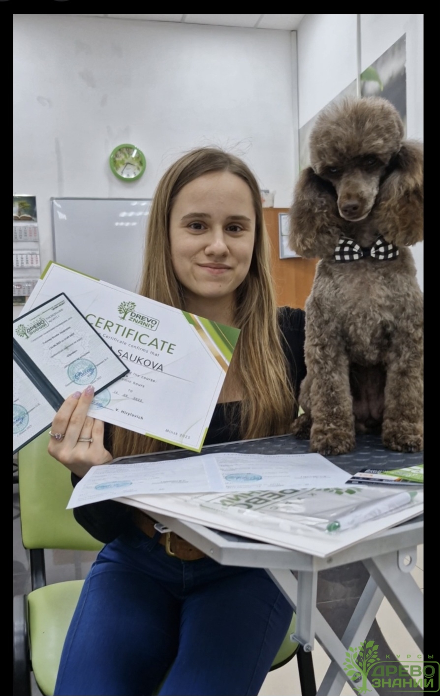 2018 год - окончила кинологические курсы от БРОЛЖ «Сириус», успешно сдала экзамен в БКО, по настоящее время продолжаю повышать квалификацию в качестве эксперта-кинолога.